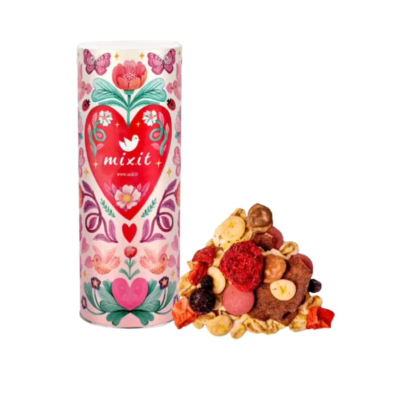 Hrdličky si zaslouží víc než zrní. Proto jsme pro vás na tento Valentýn připravili limitku, která ohromí chuťové pohárky vaší drahé polovičky. :-) Do müsli jsme přimíchali růžovou čokoládu Ruby, lyofilizované jahody, borůvky a maliny a přírodní afrodiziakum guaranu. Všichni ale dobře vědí, že snídaně do postele je mezi afrodiziaky to nejúčinnější. :-) Mix jsme dovedli k dokonalosti kokosovými chipsy, cornflakes v bílé a mléčné čokoládě a sladký je i vzletný limitovaný vzhled tubusu.